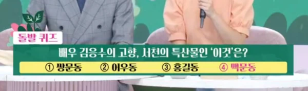 예를 들어 화요초대석에 나온 배우 김응수의 고향 서천의 특산물을 묻는 아침마당 퀴즈 문제는 아래처럼 방송에 나옵니다.